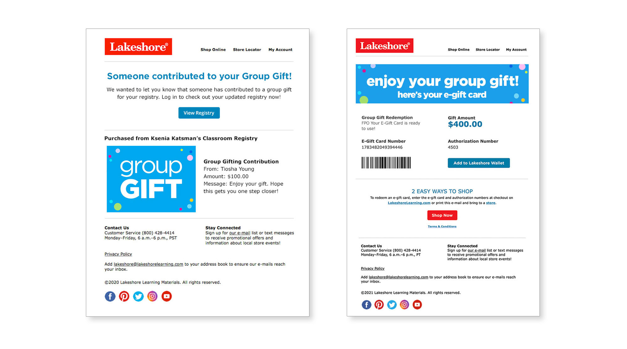 Created visual assets for Lakeshore’s Group Gift program, including a playful motif applied across the full customer journey—from contribution notifications to e-gift card redemption.