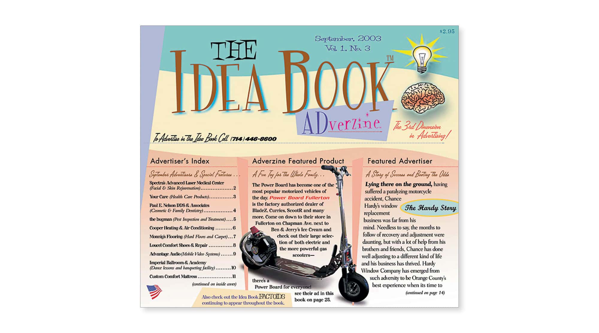 Designed the cover for The Idea Book Adverzine, a new advertising mailer featuring small businesses. Tasked with giving it a retro feel, I used a nostalgic color palette, period-inspired fonts, and a custom logo to create cohesive branding,